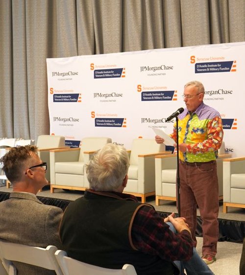 Voices of Service: A Celebration of Veterans Writing and Weekend Workshop was made possible by partnerships between the Syracuse University Press, Syracuse University Libraries, the Syracuse University D’Aniello Institute for Veteran & Military Families (IVMF), the National Veterans Resource Center (NVRC), the Moral Injury Project of Hendricks Chapel, and the Syracuse University Humanities Center.